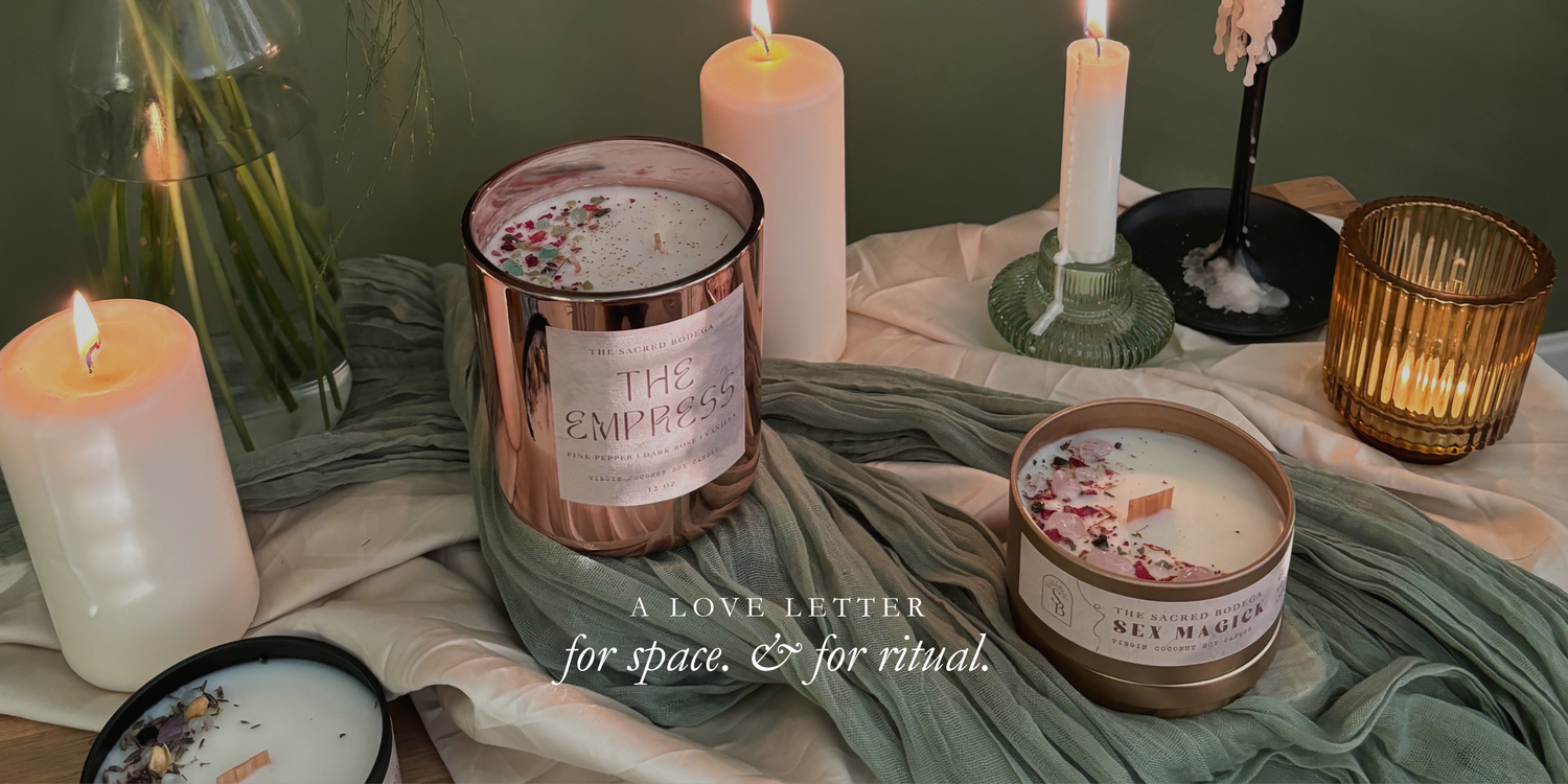 Introducing The Sacred Bodega, where luxury scent meets space + spirit. We intentionally craft home fragrances that are designed to enhance the energy of your space + daily rituals. Our mission as a brand is to create a one-of-a-kind sensory healing experience to aid in your unique healing journey. Discover what makes our eco-friendly and non-toxic candle scents pure magick!